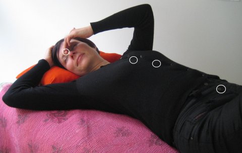 Hold/bliv 2 minutter på hvert meridianpunkt. Brug fingrene og husk at holde dem samlede. Begge hænder må ikke fjernes samtidig fra et punkt; den ene hånd skal altid ligge på et merianpunkt mens den anden flytter til næste greb. Lav øvelserne liggende eller siddende, som det passer dig bedst.